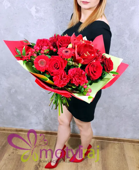 Elegancki i pełen miłości bukiet z czerwonych róż, goździków, gerber, alstromerii oraz okazałego amarylisa.