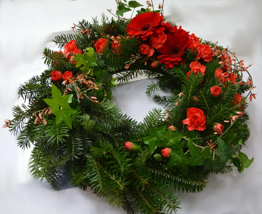 Delikatny wianek z jodły z dodatkiem gerbery i goździków.